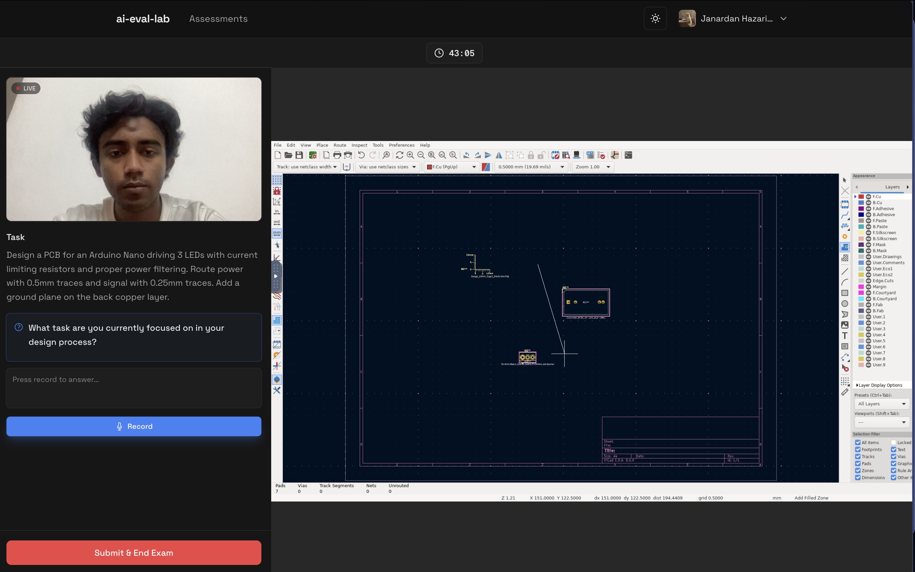 A brief intro of ai-eval-lab: a platform that streams desktop applications from a docker container (like KiCad) to the browser via VNC, captures real-time board state telemetry, and evaluates the student's process using LLMs.