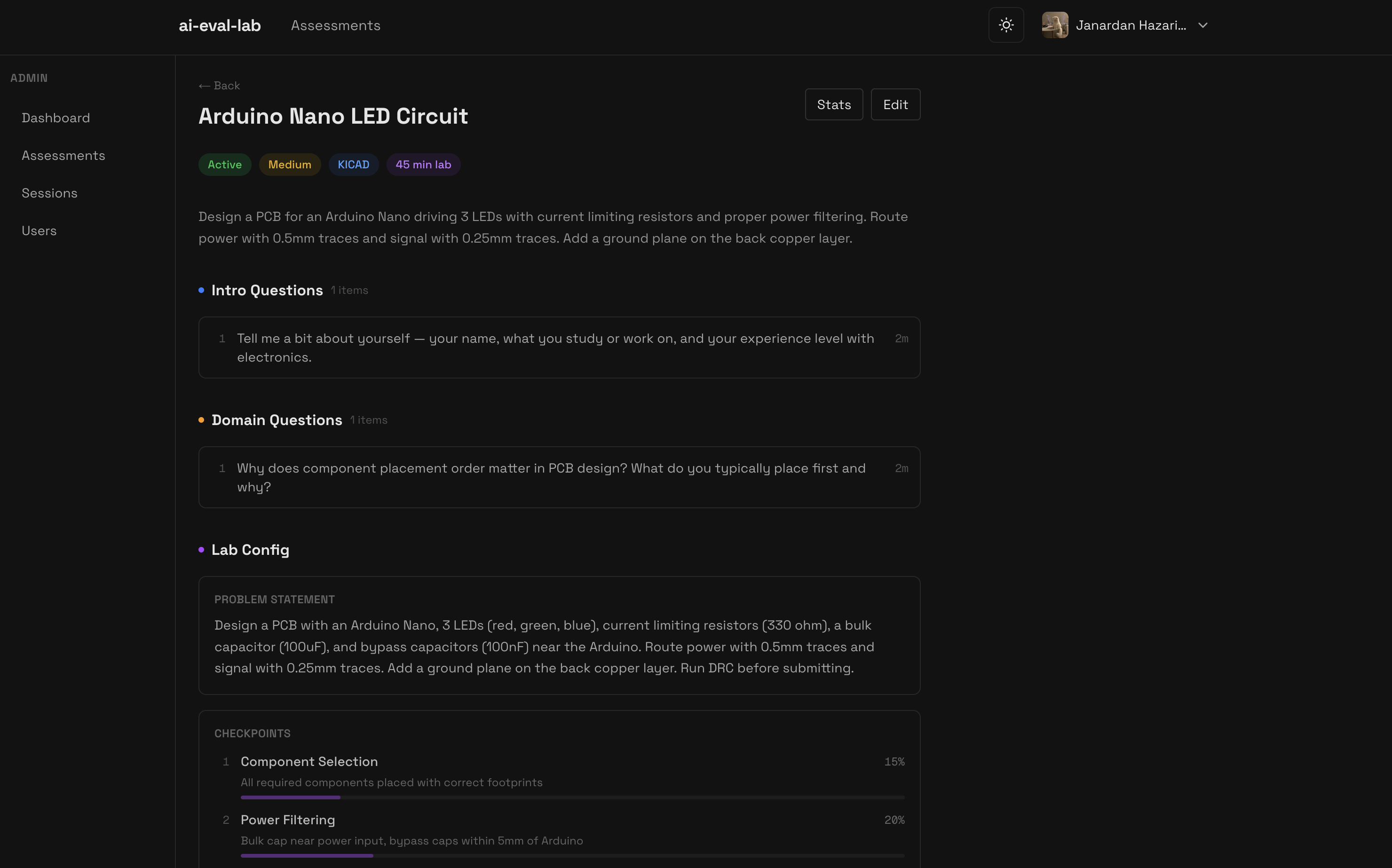 - Assessment Management: Creating new assessments, defining the KiCad files, and setting up the rubrics.